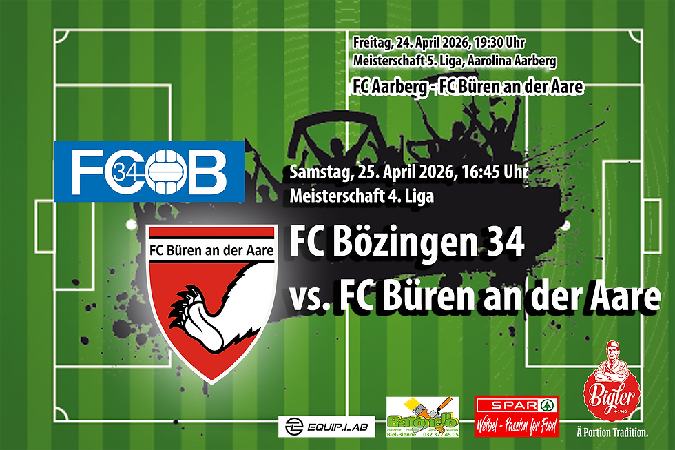 Samstag, 11. April 2026, 19:00 Uhr, Aarolina Aarberg, Meisterschaft 4. Liga Es erfröilechs Biud! Dä Samschtig isch e sehr spezielle Schpiutag. Erscht gäge Viert und Zwöit gäge dr Dritt. Die Konschtellation isch wie derfür gschaffe, bis zum Abpfiff über d'Aarolina z'fäge wie ne Orkan, Fuure y Bitz z'rysse und bis zur letschte Minute z'kämpfe mit em Mässer zwüsche de Zähn. Hüt chöit dir zeige, was dir uf em Chaschte heit, dass ds Kollektiv figuretlet und jede für jede secklet,